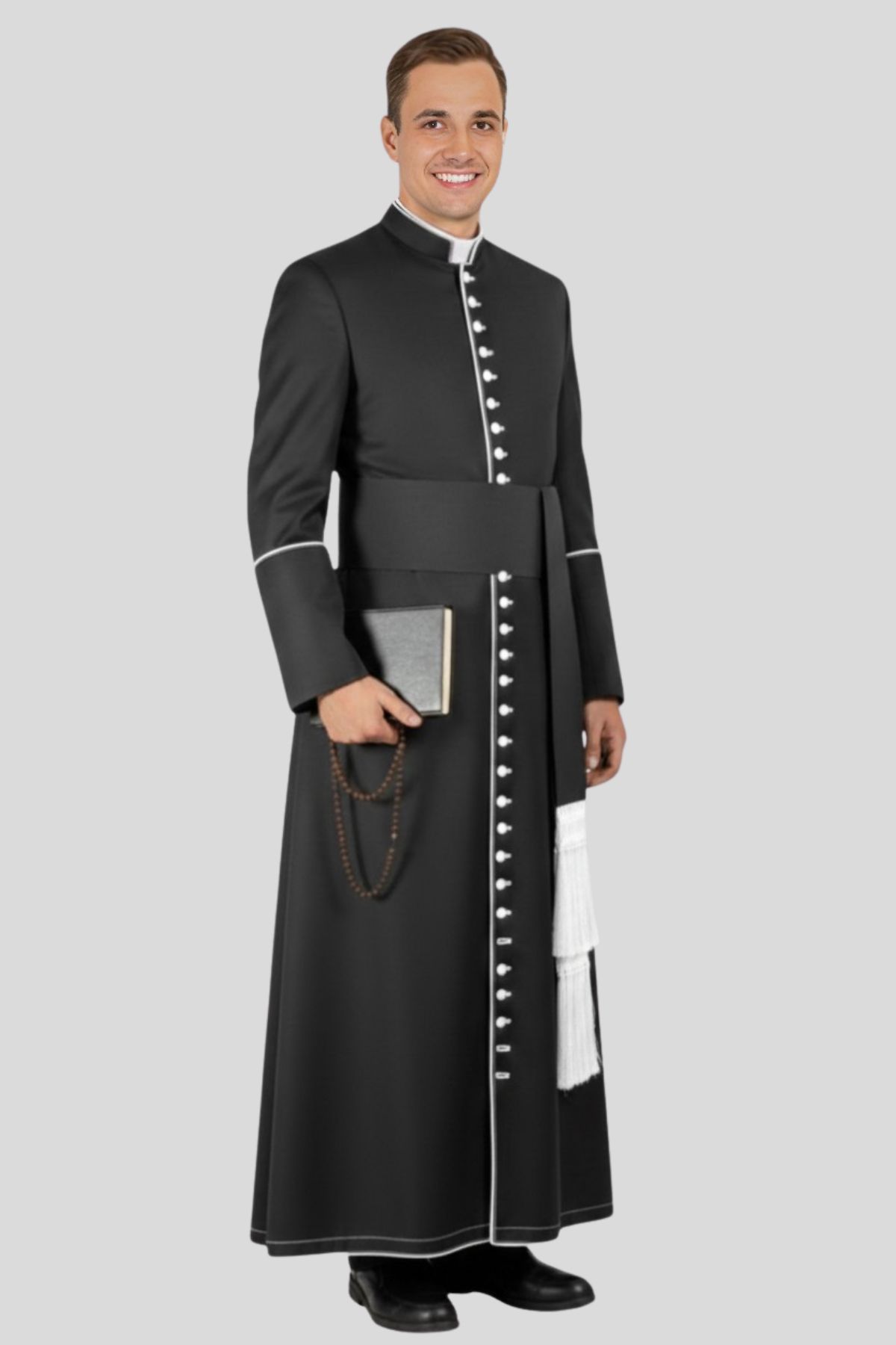 Order your Black Mens Cassock with White Trim today and experience the perfect blend of tradition, elegance, and comfort for your religious services