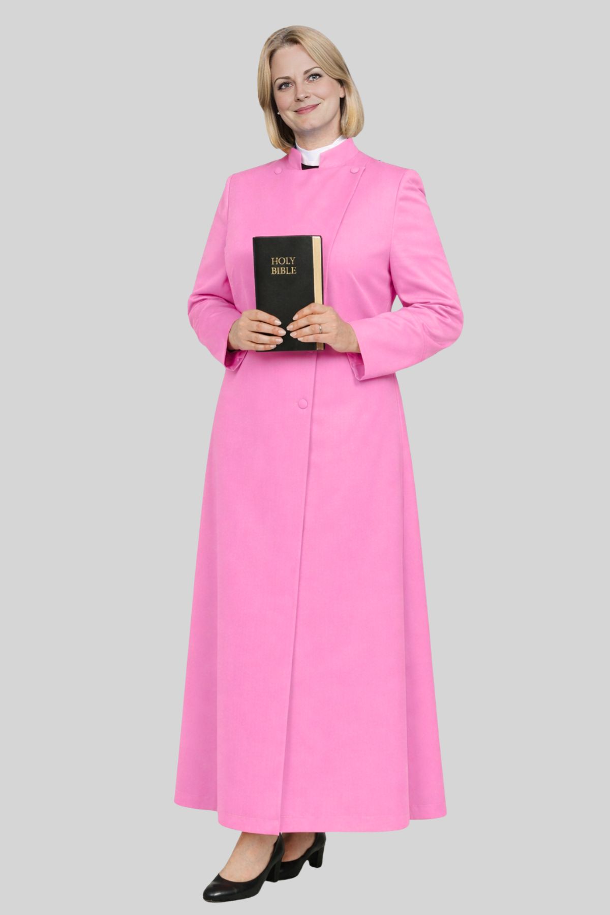 The celestial pink hue a radiant variation of traditional bishop pink—represents sacred leadership, divine wisdom, and ecclesiastical honor. Expertly tailored to follow the natural contours of the female form while maintaining modesty and grace, this cassock is perfect for female bishops, senior ministers, and Anglican or Episcopal clergy officiating on high feast days and special episcopal occasions.