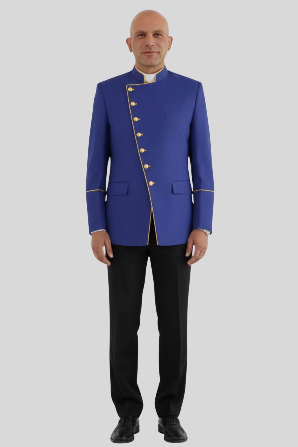 Add the Stylish Blue Clergy Coat with Gold Highlights to your wardrobe and step into every service with confidence, presence, and timeless clergy style.