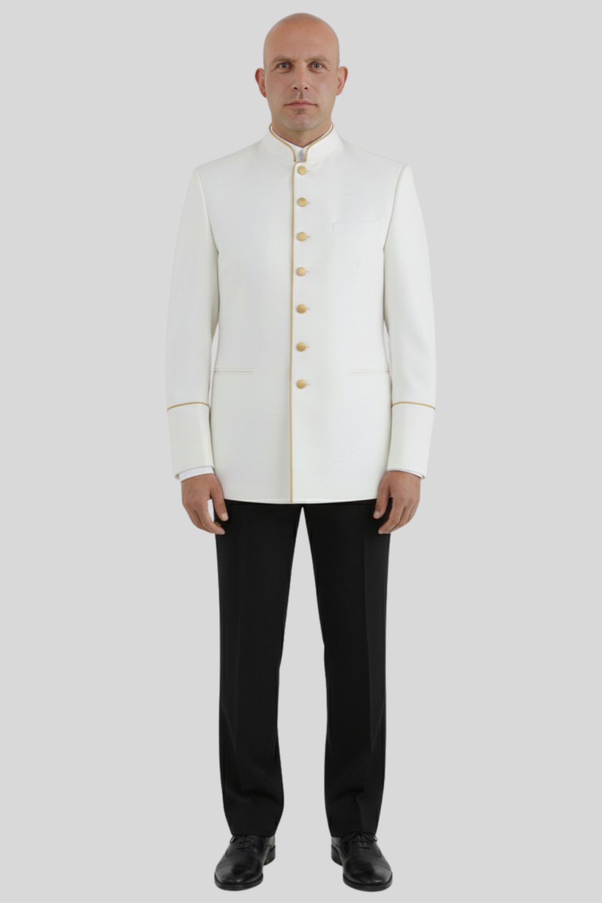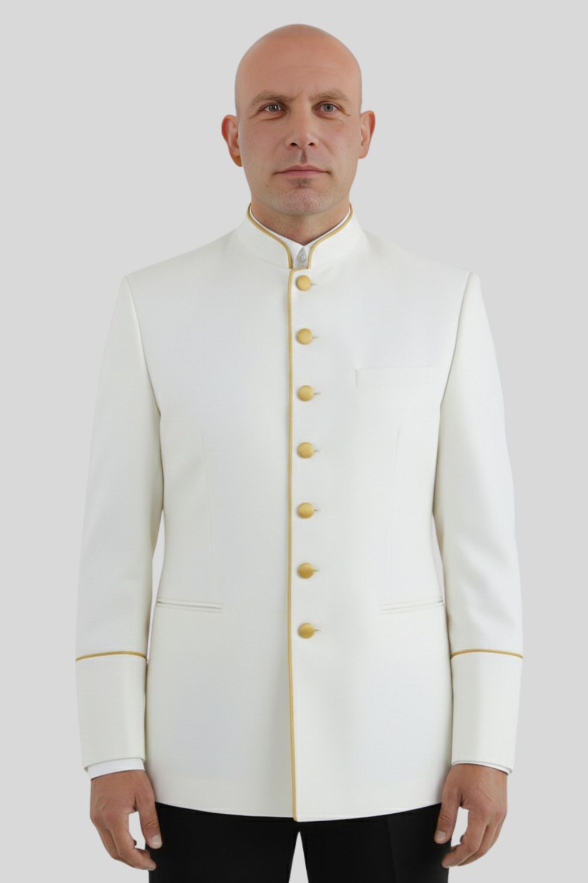 Add the Mens White Seven Button Clergy Jacket with Golden Piping to your wardrobe and lead every service with presence, confidence, and timeless style.
