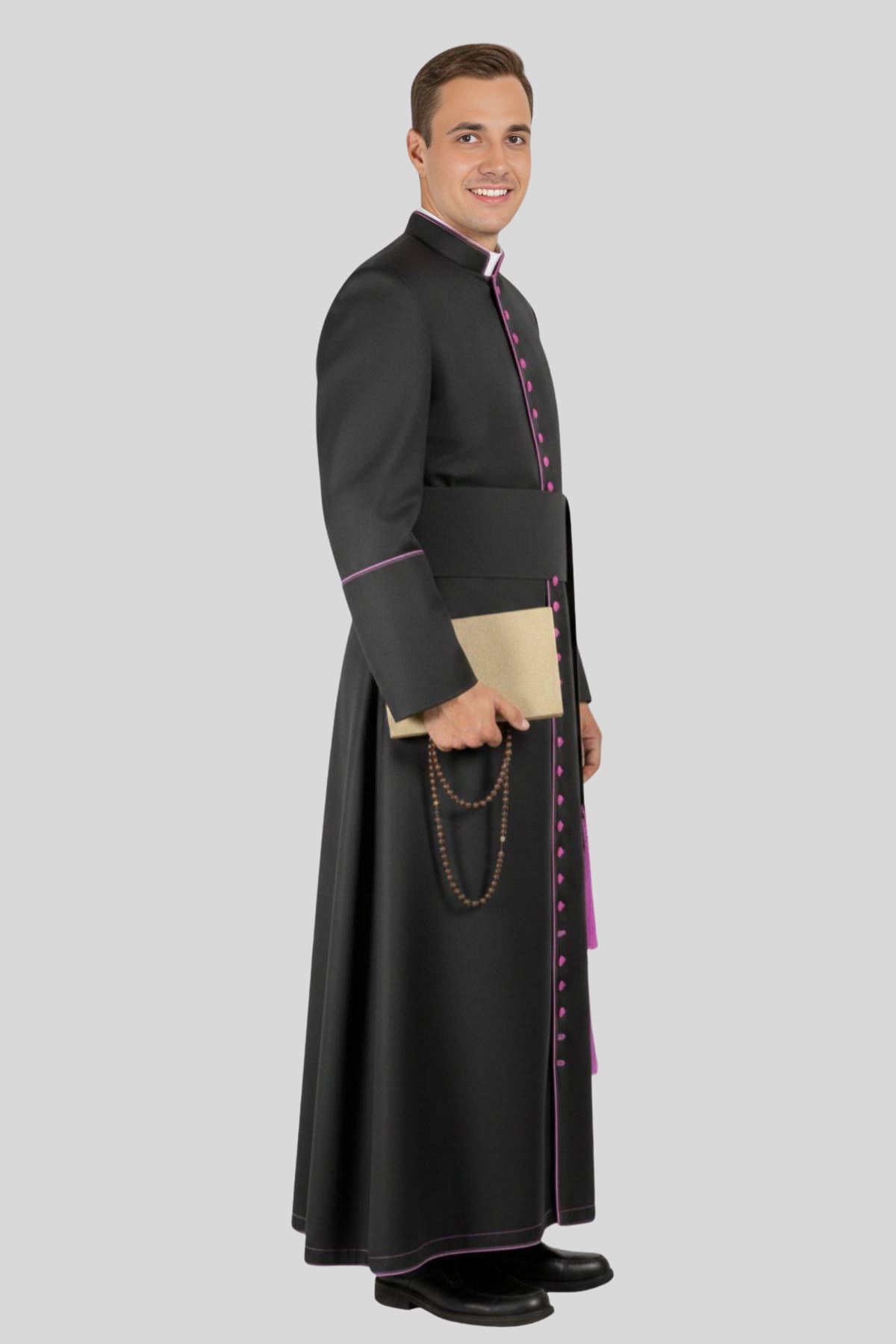The black cassock, accented with luxurious purple trim, exudes authority and grace, ensuring you make a powerful impression while maintaining the respect and reverence expected of clergy attire.