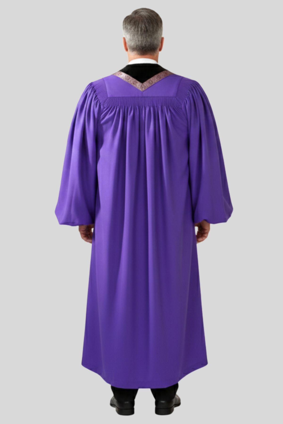 Embrace timeless style and distinguished tradition with the Luminary Roman Purple Pulpit Robe, thoughtfully designed for pastors, ministers, and clergy who seek both sophistication and practical comfort. This robe combines luxurious materials with thoughtful design, ensuring a refined appearance suitable for sermons, ceremonies, and special religious occasions. The rich Roman Purple color paired with black velvet panels creates a timeless and dignified look, making it a standout piece in any clergy wardrobe.