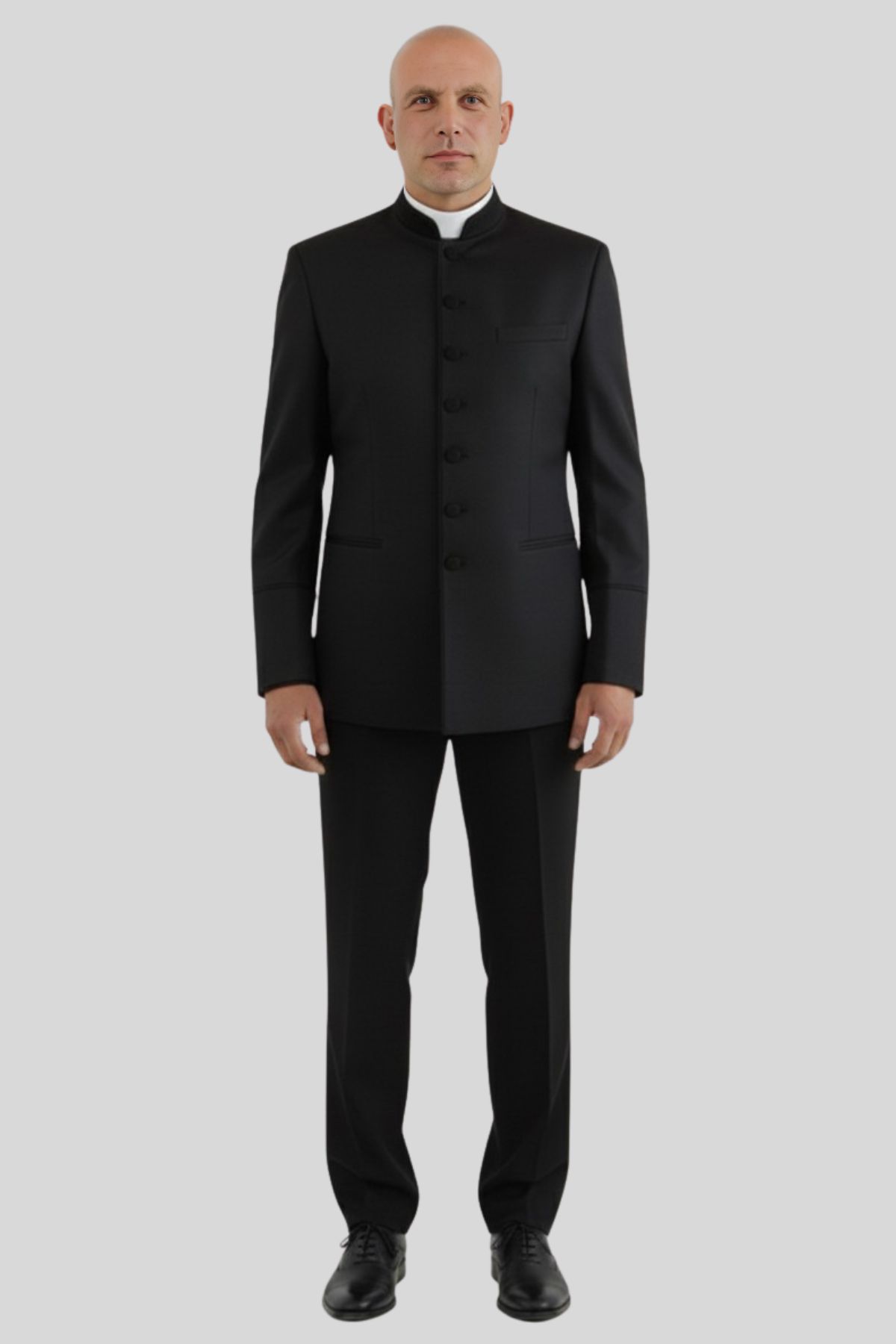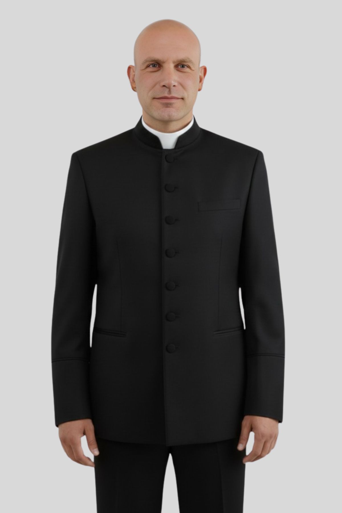 Featuring a mandarin collar for a clean, clerical look, this jacket includes seven front buttons that offer a polished ceremonial finish. Its tailored fit with precise stitching creates a structured, sharp silhouette, while functional front pockets provide practical storage for sermon notes, Bibles, or other pastoral essentials. A clean back with two side vents allows freedom of movement and comfort throughout services.