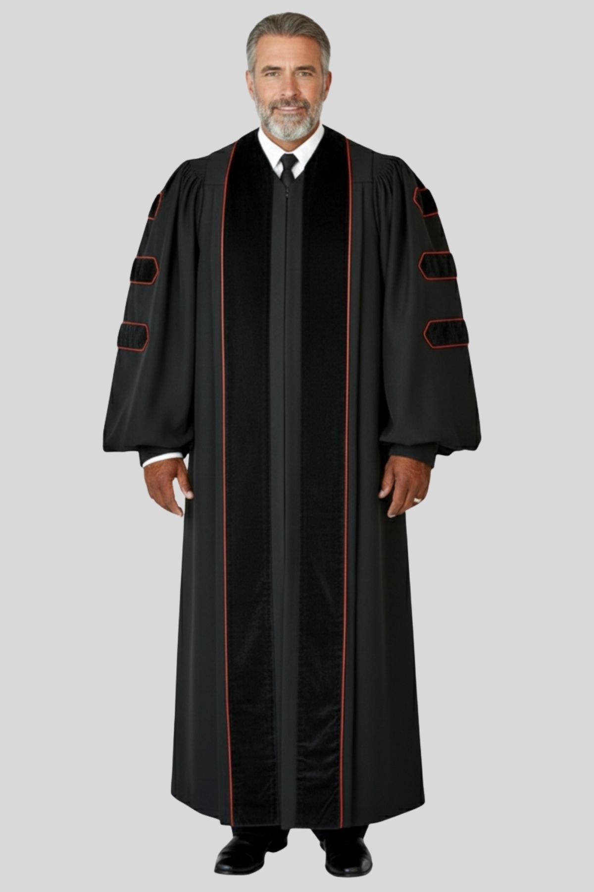 Sanctuary Black Pulpit Robe — Elegant Clergy Robe with Red Piping & Velvet Panels