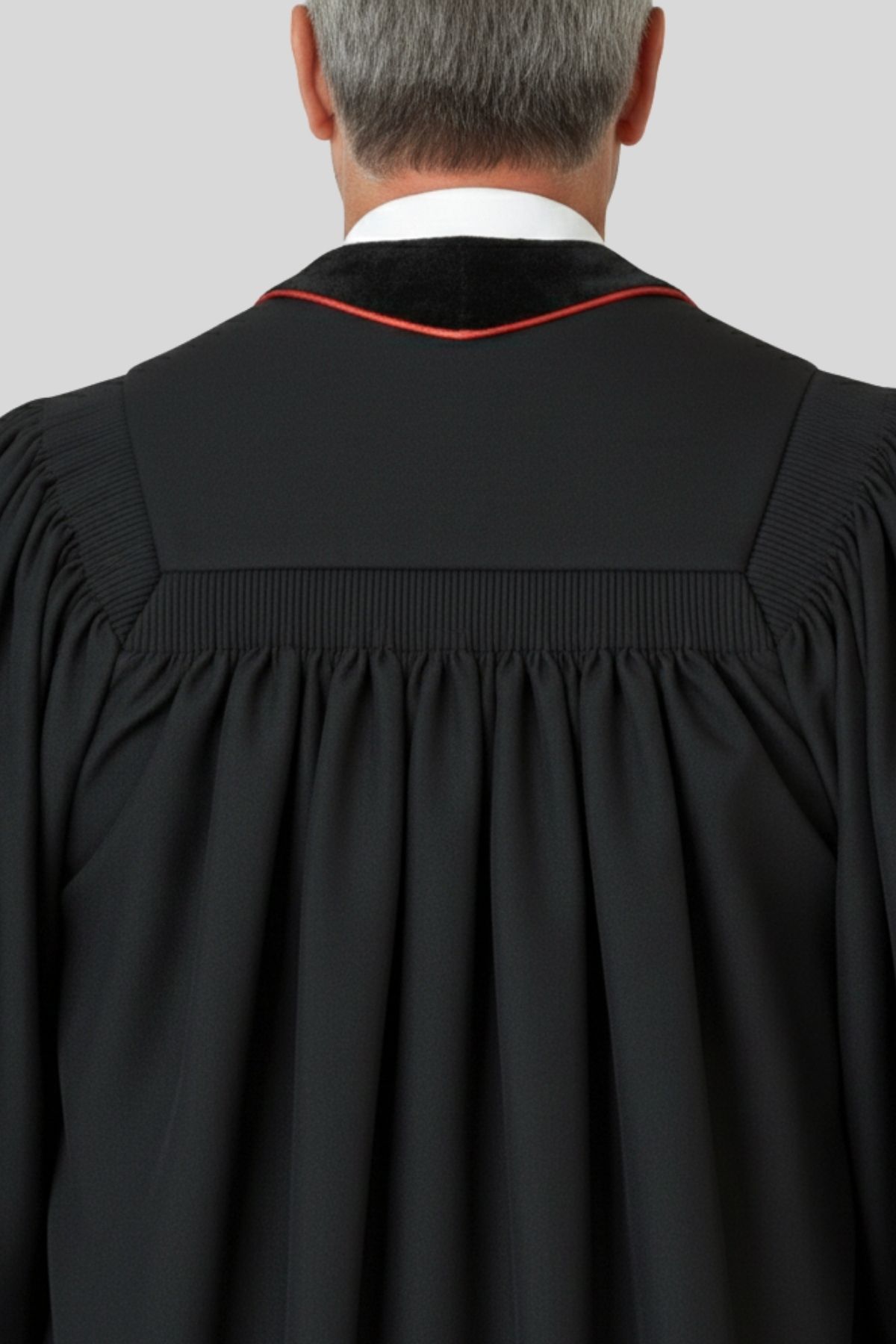 - Red Piping Accent with Velvet Panels: Two red piping lines highlight the black velvet panels, adding a tasteful modern touch without compromising the robe’s classic style.
