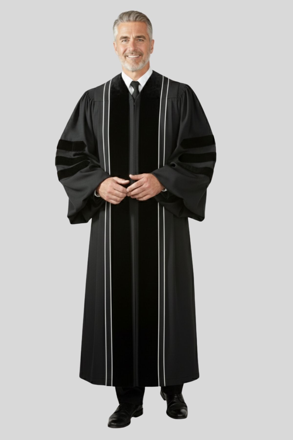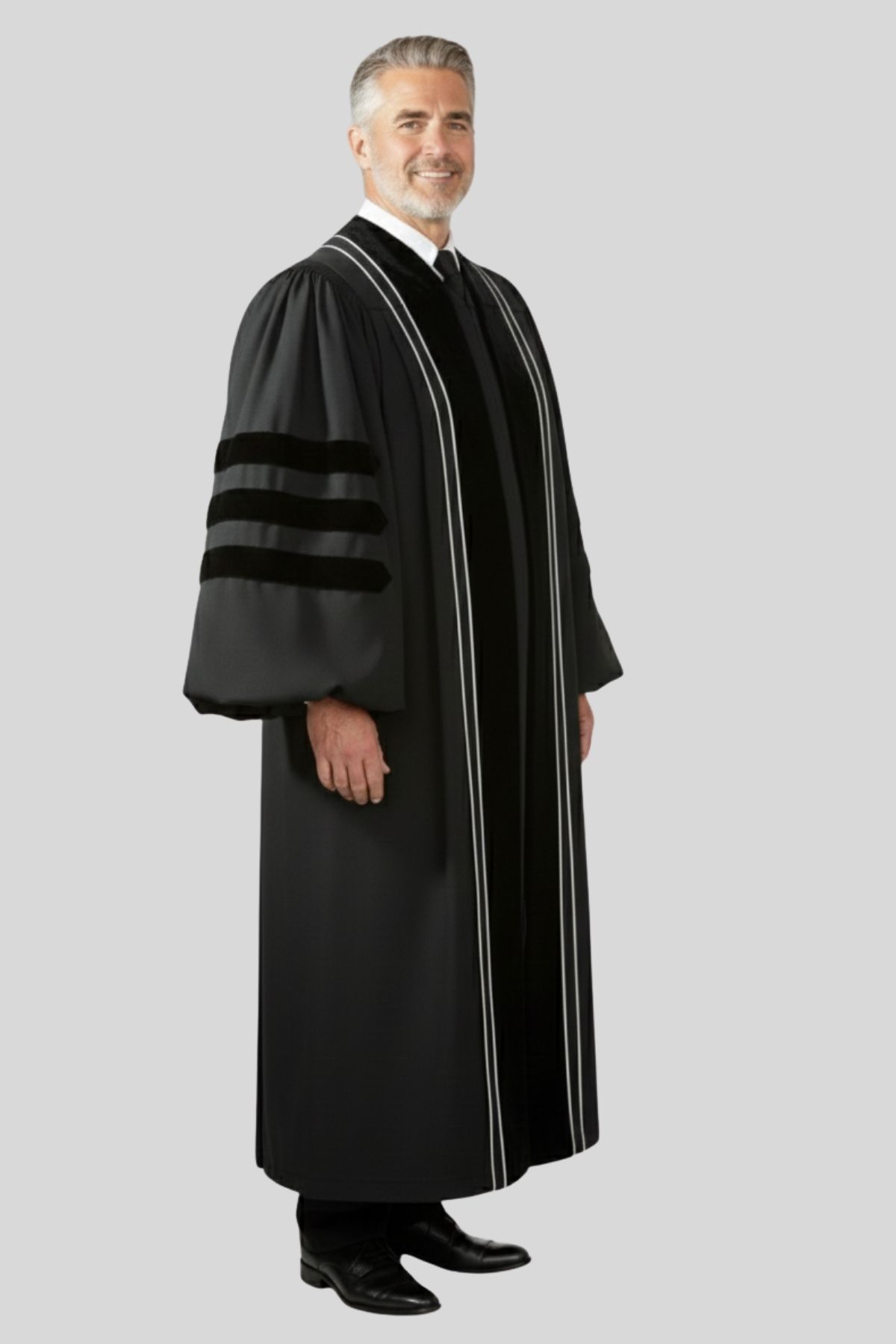 - Lined Bell Sleeves with Three Black Velvet Doctoral Bars: The wide, lined sleeves provide comfort and ease of movement. The three black velvet doctoral bars reflect traditional clergy authority and style, allowing you to preach and gesture freely without restriction.