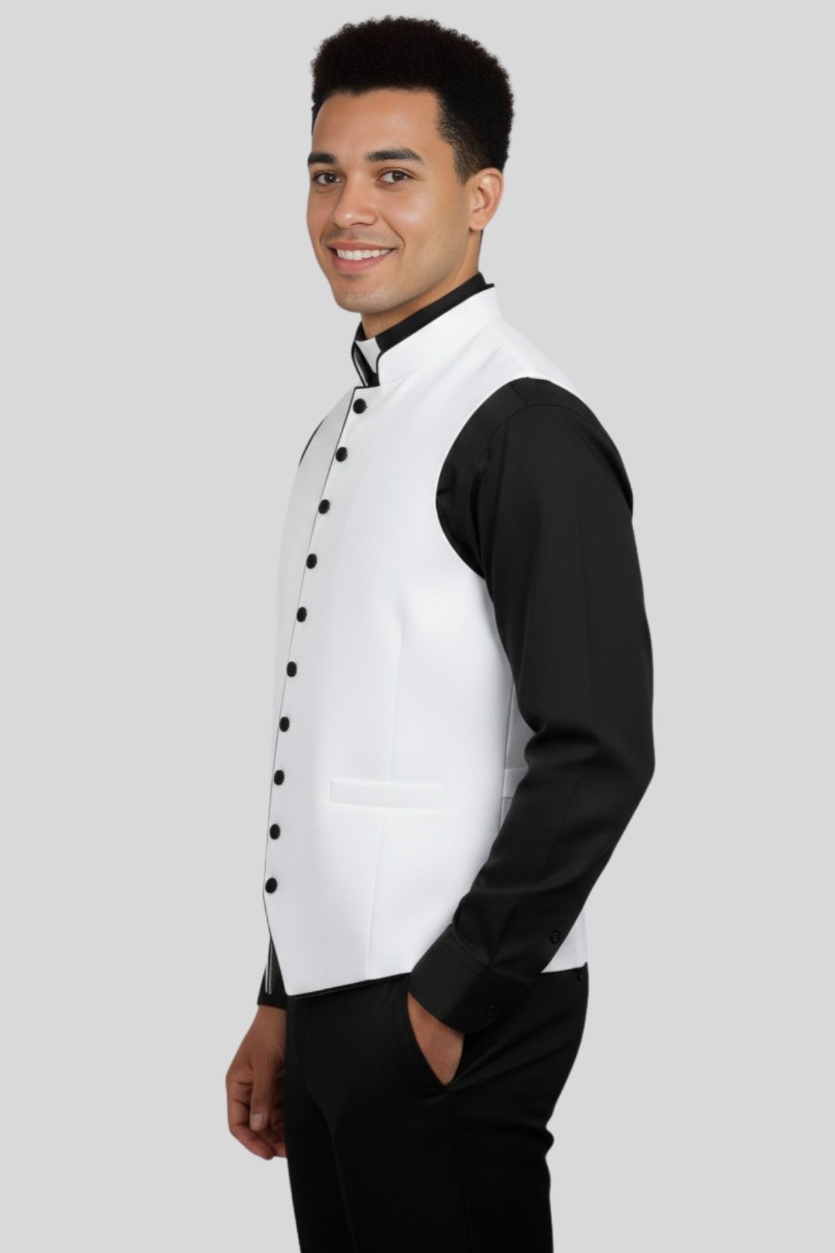 Upgrade your wardrobe with the Clean Cut White Vest with Black Accents. Order today and define your style with contrast, confidence, and modern character.